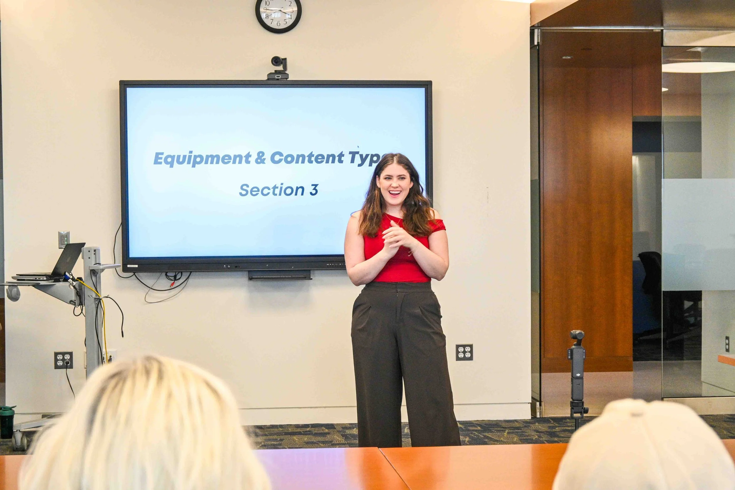 A woman in a red top and black pants standing in front of a presentation screen, smiling, in a conference room.